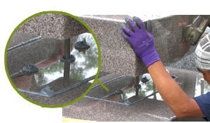 谷嶋石材では、永く綺麗な状態でお墓を保てるよう、特殊施工を行っております。見えなくなる内側部分も全て墓石用接着剤やL型金具、耐震バーでしっかり固定し、長年の風化によるズレを防ぎます。 また、納骨室にも石材を使用するので、汚れにくく通気性の高い納骨室にすることができます。