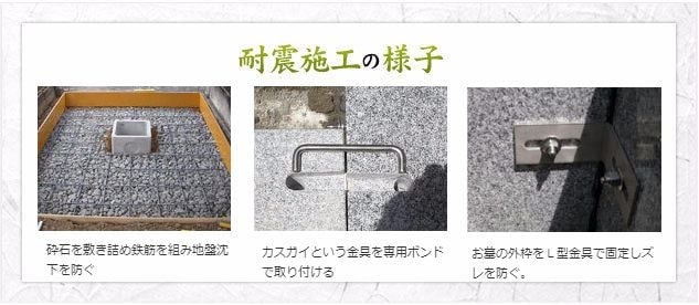 長年にわたって大切なお墓を守るために、お墓に一番重要なことは耐久性です。良い墓石を選ぶポイントは「硬度が高いこと」「石の性質」また「耐震性」であると私たち谷嶋石材は考えております。 谷嶋石材のお墓の耐震施工を使ったお墓を建てています。完成後には見えなくなりますので、谷嶋石材工業では施工の全工程を写真に納め、アルバムにしてお客さまにお渡ししています。