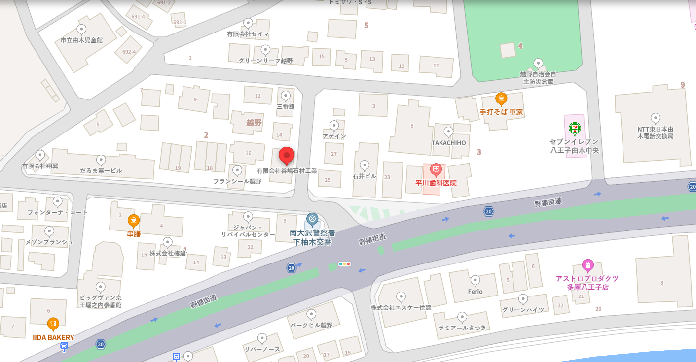 | 車でお越しの方 | 野猿街道にある【下柚木交番】付近までお越しいただくと谷嶋石材工業の看板が見えます。 駐車場:有り |